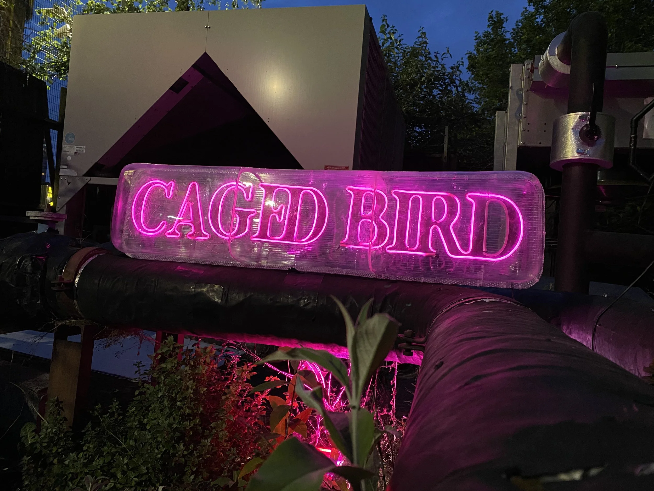 the sign was my own design, based on a brief by caged bird, heavily inspired by the clear electronics trend of the 90's.